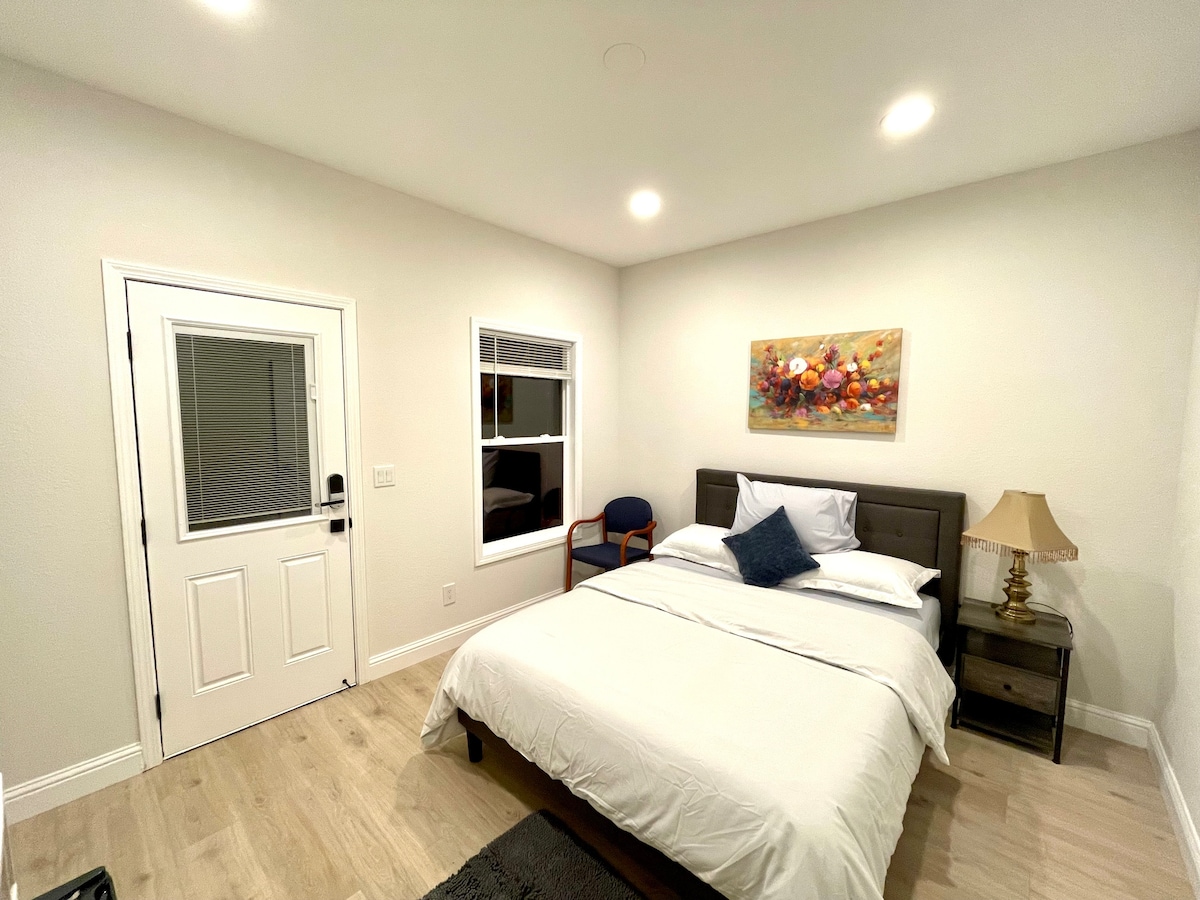 Potpuno namještena jedinica s 1 spavaćom sobom, privatnim ulazom, kuhinjom, kupaonicom i besplatnim parkingom. Opremljen svim osnovnim sadržajima za ugodan boravak. Smješteno u mirnoj četvrti u blizini središta Fremonta • 5 – 10 minuta hoda do restorana (2 minute do McDonald'sa), trgovina i supermarketa. • 3 – 5 min do autoceste 880/84 • 25 – 35 min do zračnih luka SJC/OAK/SFO Posteljina i ručnici se mijenjaju i peru nakon svakog gosta, savršeno za poslovne putnike/obitelji/duge vikend boravke!