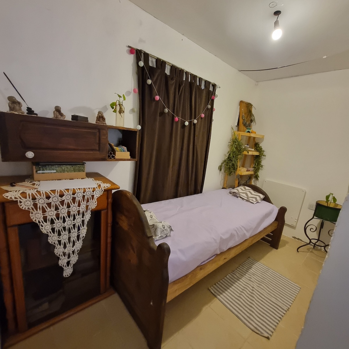 Jednokrevetna soba za 3 osobe s vrtom i roštiljem. Ima bračni krevet, jedan mali krevet (kao i za djecu) te kupaonicu s tušem i bideom koji je uključen u WC školjku. Wi-Fi. Prostor je miran i tih. Nalazi se 2 bloka od centra, 1 ulica Arístides Villanueva (područje barova i restorana najpoznatijih u Mendozi), supermarketa, banaka, praonica rublja i drugih zanimljivih mjesta. Ima dobru ventilaciju i osvjetljenje. Nalazi se 6 ulica od parka San Martin.