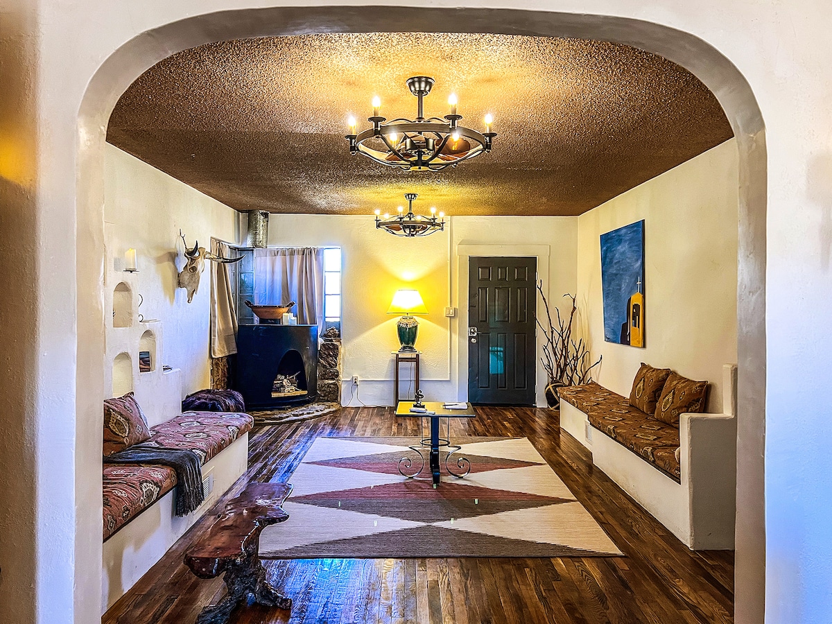 Boravite u jedinstvenom dvorcu od nepečene cigle nekoliko koraka od ceste Route 66. Ova privatna kuća u stilu hacijende ima ograđeno dvorište, kameni toranj i šarm karakterističan za jugozapad SAD-a. Uključuje 2 spavaće sobe, 1 veliku kupaonicu, blagovaonicu za 10 osoba, prostoriju za doručak s kaminom, potpuno opremljenu kuhinju i udobne dnevne boravke. Uživajte u mirnoj lokaciji pogodnoj za pješačenje u blizini znamenitosti, restorana i muzeja. Pitajte o ugovaranju termina za fotografiranje i manja okupljanja.