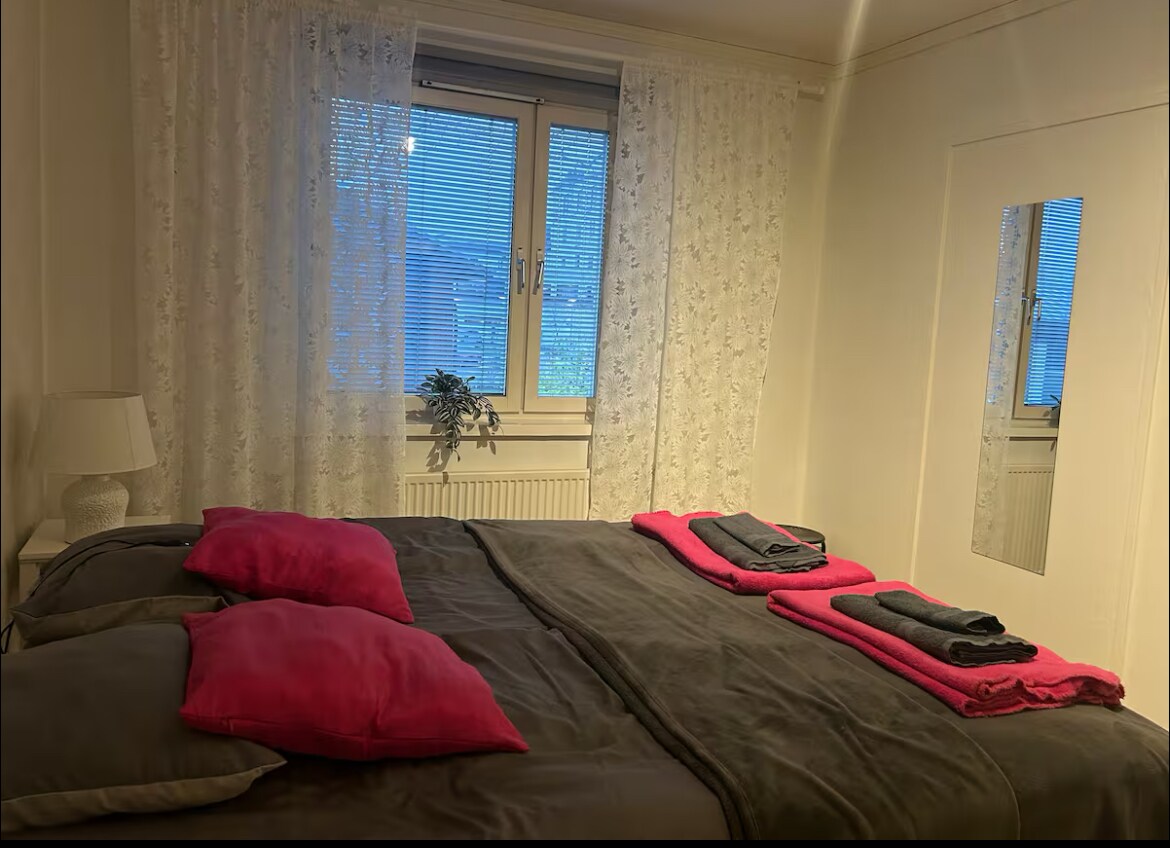 Opustite se za sebe ili s obitelji u ovom mirnom smještaju samo 2,3 km od centra grada. 30 minuta hoda. Najbliža trgovina prehrambenih proizvoda 800 m. Stražnje dvorište dostupno je ako želite roštiljati. Golemi balkon okrenut prema jugu Sauna se nalazi u kući i može se rezervirati po želji. Bračni krevet koji se može razdvojiti. Sofa za dvije osobe s madracem na razvlačenje. Dječji krevetić dostupan je bez nadoplate. Uključena je posteljina i ručnici. Potpuno opremljena kuhinja.