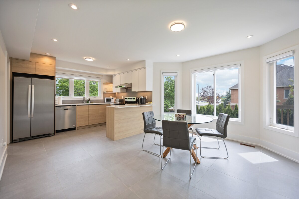 Potpuno renoviran, moderan, svijetao, luksuzan i prostran ( preko 1800 četvornih metara), 2 spavaće sobe, 2 kupaonice na stropu iznad zemlje, zaseban ulaz i terasa za vaš sljedeći udoban dom daleko od doma! 5 zvjezdica i 5 najboljih smještaja na Airbnbu! U središtu je GTA-a. Bit ćete u blizini zračne luke Pearson, autoceste 401/404/407, trgovačkih centara, supermarketa i mnoštva popularnih restorana, kina, parkova i biciklističkih/ planinarskih staza. Rezervirajte s povjerenjem!