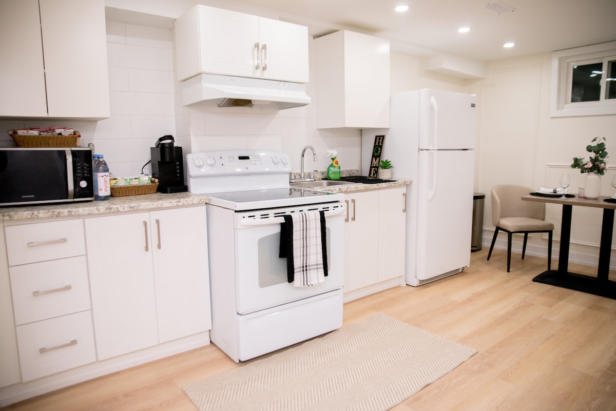 1 spavaća soba • 1,5 kupaonica • privatni cijeli prostor Nedavno renovirano i mirno, samo nekoliko minuta od autoceste 401 i lokalnih restorana. Izdvojeno • Samostalni ulazak u smještaj • Parkiralište na prilazu objektu za 1 automobil • privatna sauna • Televizor od 55 inča s Netflixom Sadržaji Čisti ručnici, posteljina, četkice za zube i paste, sušilo za kosu, osnovna oprema za dom, osnovna oprema za tuširanje i dodatni jastuci/ručnici na zahtjev. Besprijekoran smještaj, brzi odgovori i zajamčena udobnost – rezervirajte s povjerenjem.