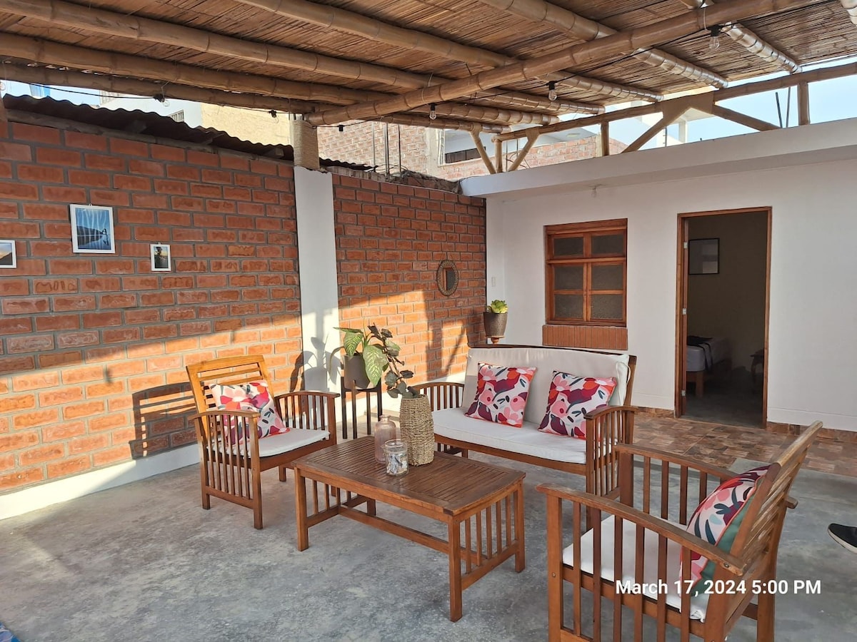 Comfortable 5-bedroom duplex with bathroom and hot water. Capacity for up to +12 people, just 1 block from the main boardwalk and steps from Playa Blanca. Cable TV, free WiFi, equipped kitchen and large terrace with grill, ideal for meetings and relaxation. Price for entire accommodation, same group or family. Does NOT include bed linen (sheets, blankets, towels), but pillows. Bed linen service available for S/. 40 per person, by prior arrangement, charged upon arrival. Guarantee S/. 750