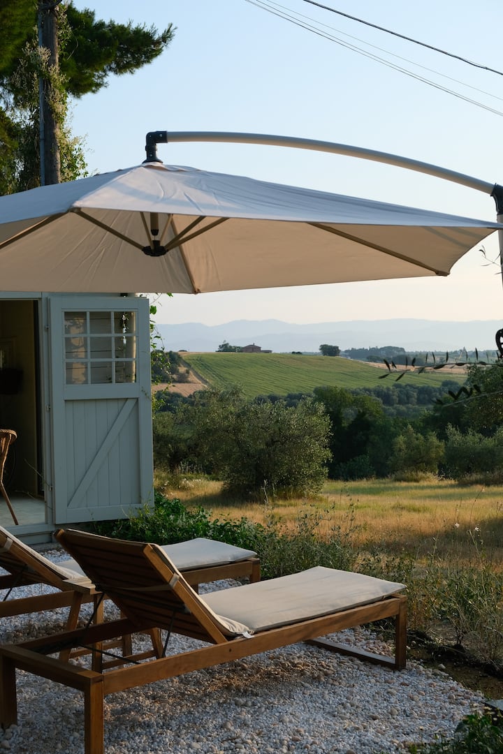 Izađite van i pređite ulicu i otkrit ćete još jedan od naših omiljenih dijelova La Loroa – naš privatni vrt (odvojen od svih drugih susjeda ili imanja), mali nadzemni privremeni bazen (*lipanj – kolovoz), malu drvenu kuću i terasu, blagovaonicu i stol – s najljepšim svjetlom, valovitim stablima maslina i pogledom na jezero Trasimeno i Castiglione del Lago.