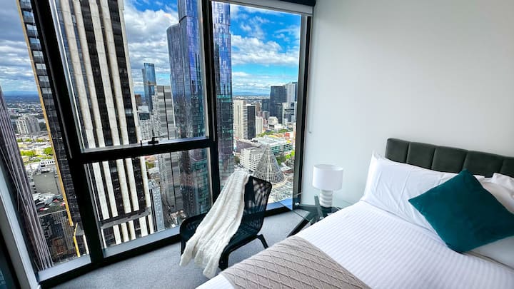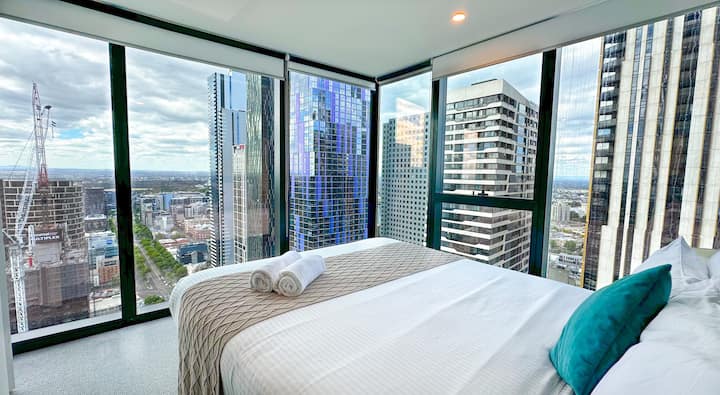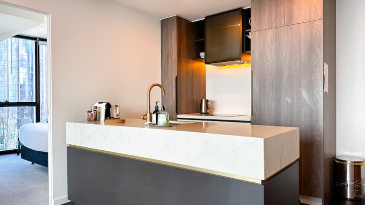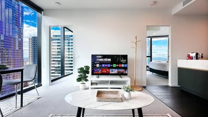 Prozori od poda do stropa ispunjavaju prostor prirodnim svjetlom i pružaju prekrasan pogled na grad. Opustite se u udobnom dnevnom boravku, dobro se naspavajte u vrhunskom krevetu i uživajte u pristupu modernoj teretani i grijanom unutarnjem bazenu.