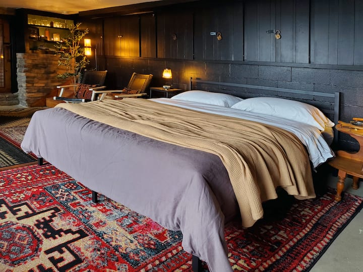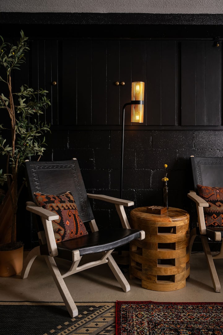 Dena u prizemlju je tamna i ćudljiva alternativa sestrinskom prostoru odmah iznad, s ocjenom s 5 zvjezdica, gostom Favorite Dark Sky Den i koji se nalazi u LOCALE Magazineu. Opustite se u ovom suvremenom studiju u nomadskom stilu. Uređenje interijera prepuno je pažljivo uređenih detalja, prilagođenih i starinskih detalja te prirodnih materijala i tekstura, kao i prigušena, nisko osvijetljena rasvjeta koja stvara ambijent koji djeluje iznimno ugodno.