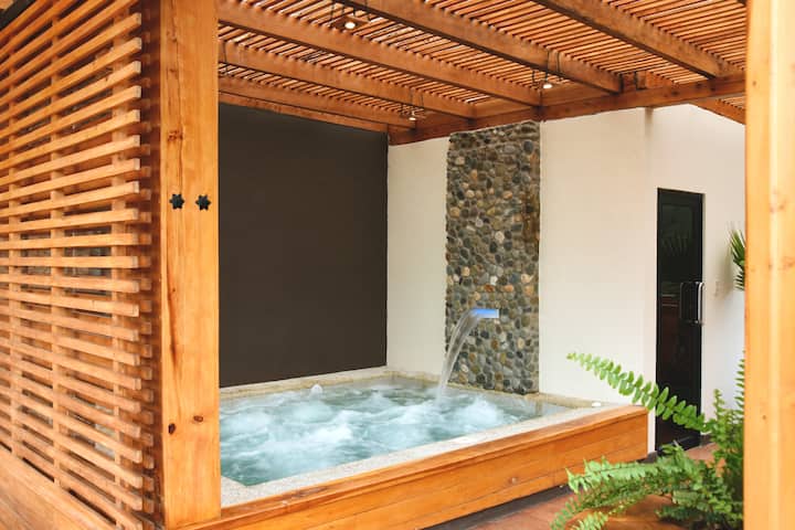 Na gornjem katu ispod krova pronaći ćete naš prostrani jacuzzi s grijanom vodom, s noćnom rasvjetom i vodenom kaskadom, idealan za opuštanje i uživanje u hidromasaži koja će vas u potpunosti obnoviti, a pored toga imamo našu tursku kupaonicu koja sa svježim eukaliptusom svježe izrezana iz naših šuma možete s vodenom parom stimulirati živčani sustav, favorizirajući cirkulaciju i opuštanje. U ovom ćete prostoru pronaći i idealno mjesto za hidrataciju ako koristite tursku kupelj i/ili jacuzzi, pored prekrasne pletene sobe koja ima 40"Smart TV s Netfilxom, Youtubeom, Xtrimom, IPTV-om s više od 1000 nacionalnih i međunarodnih kanala te s više od 10 000 serija i filmova, koje također možete gledati dok uživate u jacuzziju. Naći ćete kupaonicu s WC-om i osnovnom opremom: toaletnim papirom, sapunom, šamponom, ručnicima i tušem s toplom vodom. Ispred kupaonice nalazi se garderoba koja se može koristiti na ulazu ili izlazu iz jacuzzija ili turske kupelji.