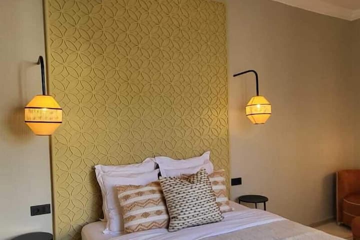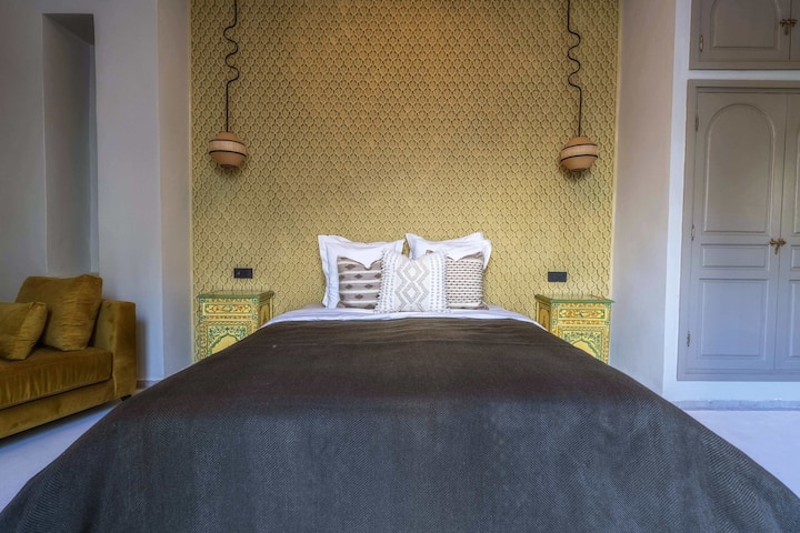 Čim uđete na vrata, dočekat će vas udoban bračni krevet, savršen za odmor nakon dugog dana razgledavanja . Pogled s balkona na terasi Riad je prekrasan i možete se opustiti uživajući u krajoliku. Vlastita kupaonica opremljena je Tadelakt tušem, tradicionalnom marokanskom građevinskom tehnikom.