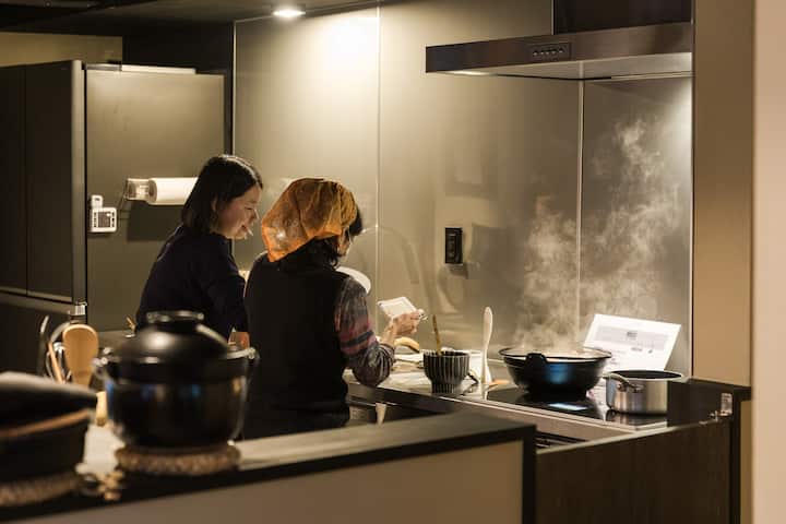 Zemljani pod opremljen je prostranom kuhinjom i čitavim izborom pribora za kuhanje. Kuhinja je opremljena roštiljem s indukcijskim štednjakom, kuhalom za rižu, tosterom, mikrovalnom pećnicom, loncima, tavama, priborom za kuhanje i raznim začinima, posuđem, priborom za jelo i šalicama. Možete ponijeti lokalnu hranu i uživati u zajedničkom kuhanju u svojoj sobi.