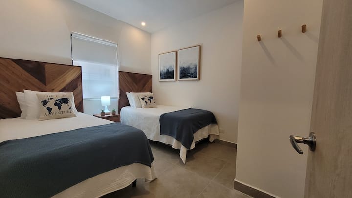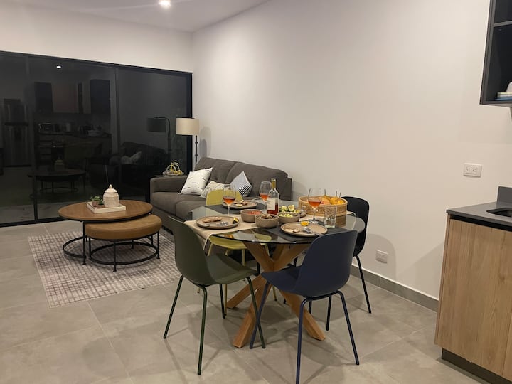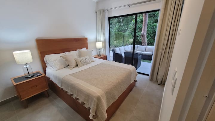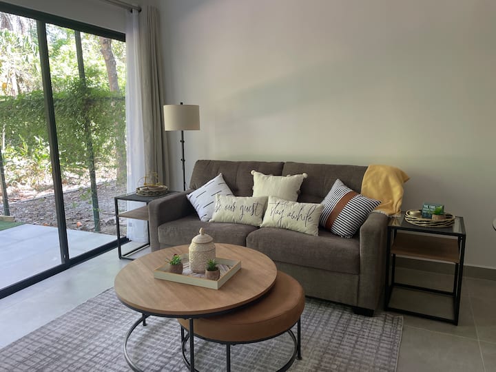 Otkrijte spokoj u potpuno novom dvosobnom stanu s 2 kupaonice koji se nalazi u zaštićenoj ograđenoj četvrti Los Delfines Golf and Country Club na južnom poluotoku Nicoya, 1 od 5 plavih zona na svijetu. Ovaj kondominij od 300 četvornih metara s privatnim dvorištem od 300 četvornih metara okrenutog prema terenu za golf udaljen je 10 minuta mirne šetnje do prekrasne plaže Tambor, gdje ćete vidjeti šarene makae, majmune, iguane i jelene! Uživajte u golfu, pickleballu, tenisu, košarci, odbojci na pijesku i jogi.