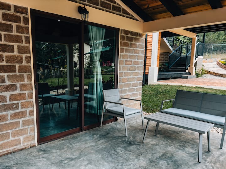 4 - Koliba s visokim krovom, terasom i vrtom.