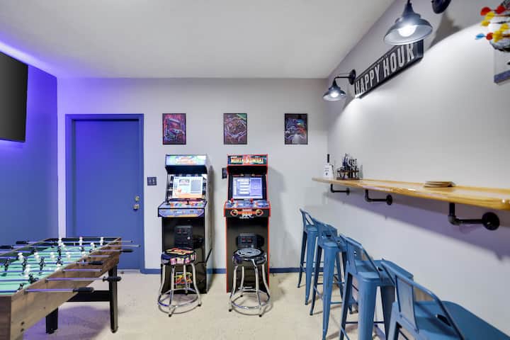 Uživajte u našoj bonus igraonici! Smještena pored kuhinje, naša igraonica ima dva retro štanda za igre ( Mortal Combat & Street Fighter, biljarski stol od 2,5 metra, stol za stolni nogomet/stol za stolni tenis Combo i bar i LED TV od 63 inča za igre/sport! Uživajte i uživajte u sitnim noćnim satima ili provedite kvalitetnu obiteljsku noć igrajući za TITULU!