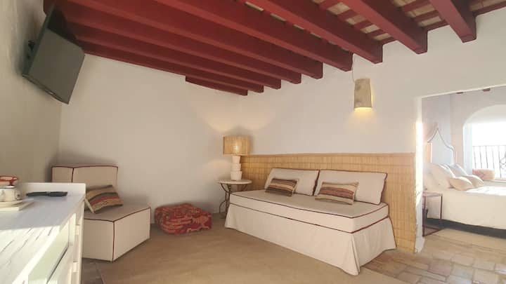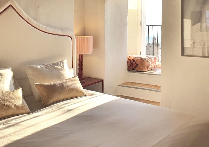 Naša soba 5 Red Suite s balkonom s pogledom na Plaza de España prostrana je i svijetla soba s dnevnim boravkom i spavaćom sobom, uređena u jedinstvenom i šarmantnom stilu. Smješteni na drugom katu, iz ove sobe možete uživati u prekrasnom panoramskom pogledu, promatranju dolazaka i odlazaka na trgu, kao i u spektakularnom pogledu na horizont.