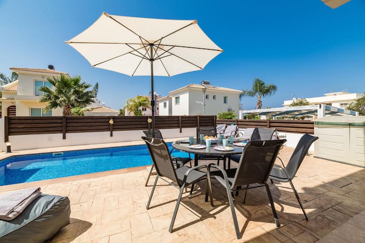 Vanjski prostor u potpunosti je ograđen, stvarajući skrovit prostor s privatnim bazenom koji je idealan za ležerne dane uživajući na ciparskom suncu. Ležaljke za sunčanje i zasjenjena blagovaonica upotpunjuju uređenje prostora, što gostima omogućuje da uživaju u jelima ili se opuste na otvorenom u privatnosti.