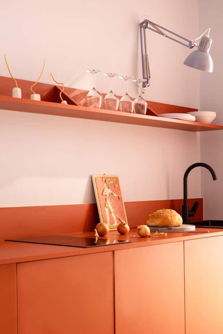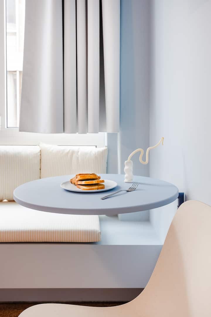 Dok ulazite u studio, dočekuje vas razigrani dizajn s odvažnim tonovima bluesa i crvenih koji prekrasno nadopunjuju originalne mozaične podove. Pažljivo osmišljen raspored postavlja kuhinju, kupaonicu i prostor za spavanje s jedne strane, stvarajući otvoren i prozračan prostor. Kupaonica je jedinstvena značajka, uređena s okruglim otvorom kako bi se omogućilo prodiranje prirodnog svjetla, dodajući dašak elegancije modernom dizajnu.