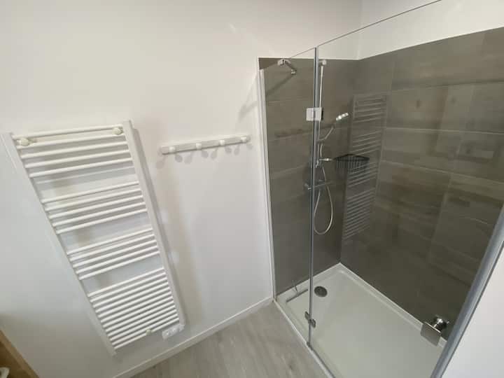 Kupaonica s tušem, opremljena perilicom i sušilicom rublja za dodatnu udobnost.