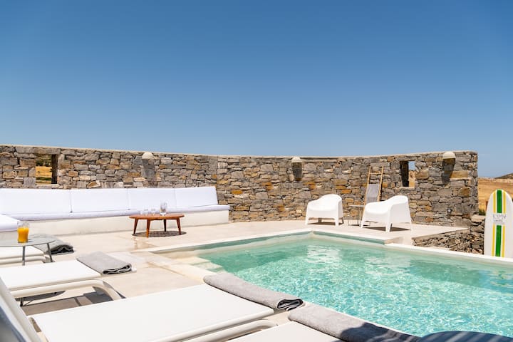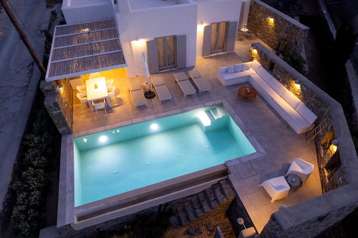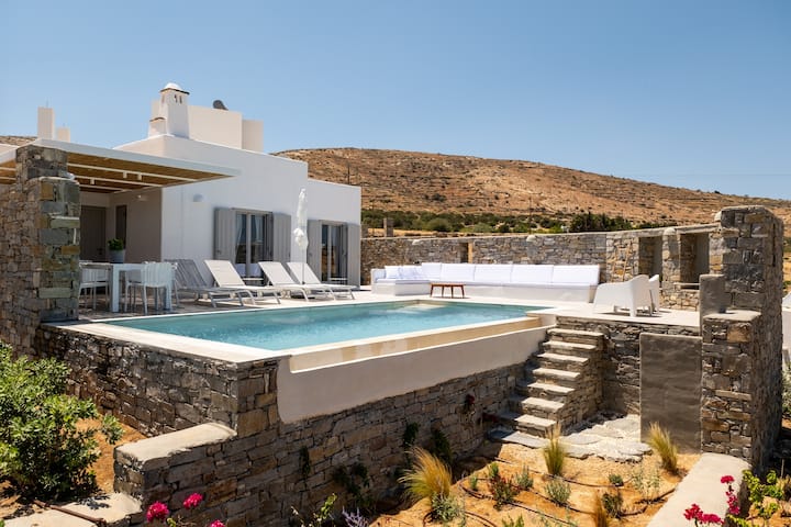 Iz vanjskog prostora vile s privatnim bazenom i prostranom terasom pruža se panoramski pogled. U daljini se vidi Egejsko more, a na horizontu se vidi otok Naxos. S vaše desne strane nalazi se samostan Agios Antonios iz 16. stoljeća koji se uzdiže na vrhu brda Kefalos. Kad padne noć, svjetlucava svjetla Prodromosa stvaraju čarobni ambijent, čineći večeri uz bazen doista nezaboravnima.