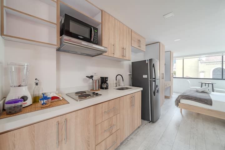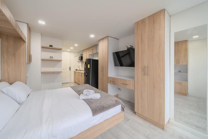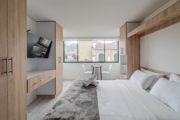 Imamo 11 studio apartmana u samom srcu Bogote koji su uređeni tako da se osjećate kao kod kuće. Nalazimo se u Teusaquillu, nekoliko minuta od Movistar Arene, El Campína i Chapinera, a sve što vam je potrebno nalazi se u blizini: prijevoz, supermarketi, sveučilišta i dobra mjesta za jesti. Naši su prostori udobni, dobro uređeni i njima upravlja stručni tim koji vodi računa o svakom detalju.