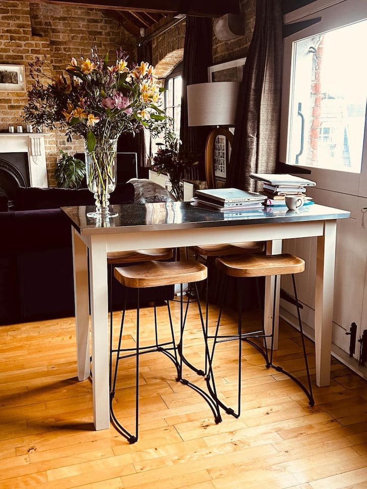 Uz visoke, dvostruke stropove i velike prozore koji gledaju na krovove s obje strane, ovaj stan na trećem katu pruža prekrasan osjećaj prostora i uživanje na suncu od zore do sumraka. Nasljeđe zgrade kao bivše tvornice divokoze prije mnogo desetljeća slavi se: izložena cigla i greda i izvorni vitlo koje bi podiglo kožu do trećeg kata – svi se kombiniraju kako bi ovom domu pružili neospornu toplinu, stil i zadivljujući faktor.