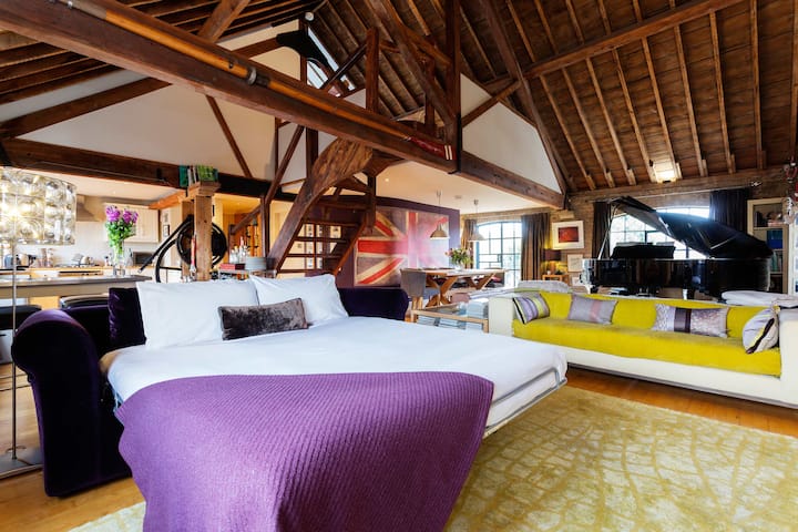 Veliki, hrastov stol u blagovaonici s prostorom za osam osoba nalazi se na dramatičnoj pozadini legendarnog murala Vivian Westwood u starinskoj crvenoj, bijeloj i plavoj zastavi Union Jacka. Veliki klavir stvara elegantnu izjavu i krije mali kutak s udobnom foteljom u raskošnoj koži boje čokolade – savršena za čitanje knjige u toplom sjaju kasnog poslijepodnevnog sunca. A tu je i mnogo knjiga koje gosti mogu pregledati. Umjetnička djela također obiluju s naglaskom na organsko, što odražava ljubav vlasnika prema prirodi i unosi prirodu u ovo cool urbano okruženje. Na donjoj etaži nalazi se dramatična kupaonica za goste koja vas uvija u svjetlucavim bakrenim pločicama u koritu rijeke i tuš-kabinom u ravnini poda. Vani se nalazi balkon sa stolom i stolicama za dvoje.