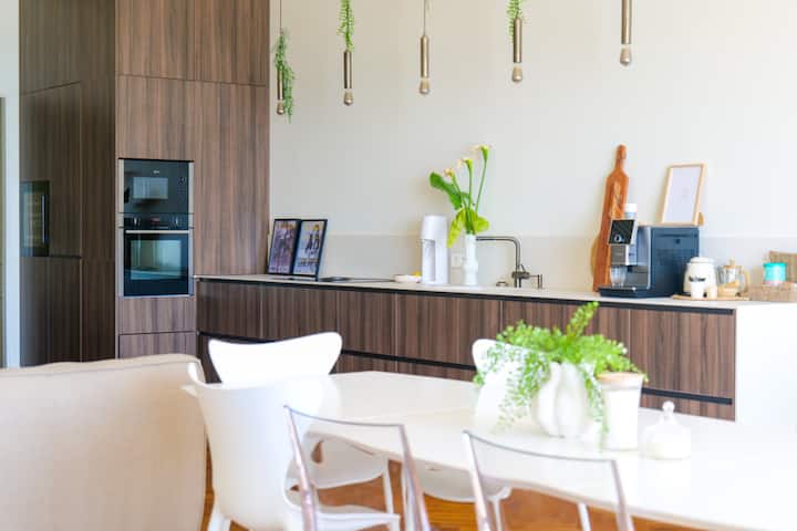 Indukcijske ploče za kuhanje, pećnica, mikrovalna pećnica, kuhalo za vodu, aparat za kavu u zrnu, perilica posuđa, hladnjak, zamrzivač i brojni prostori za odlaganje.