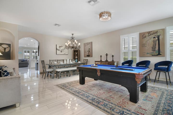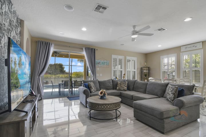 Unutrašnjost je još bolja! Prostorni zvuk na stropu u glavnom dnevnom boravku, naslonjena sjedala i ozvučenje na katu čine 2 kazališne sobe u kojima svi mogu uživati! Otiđite u bilo koju od prostorija za igre i zaigrajte bilo koju od igraonica, stolnih igara ili Xbox Game System! Dva velika pametna televizora s ogromnom sofom čine ga savršenim mjestom za druženje.