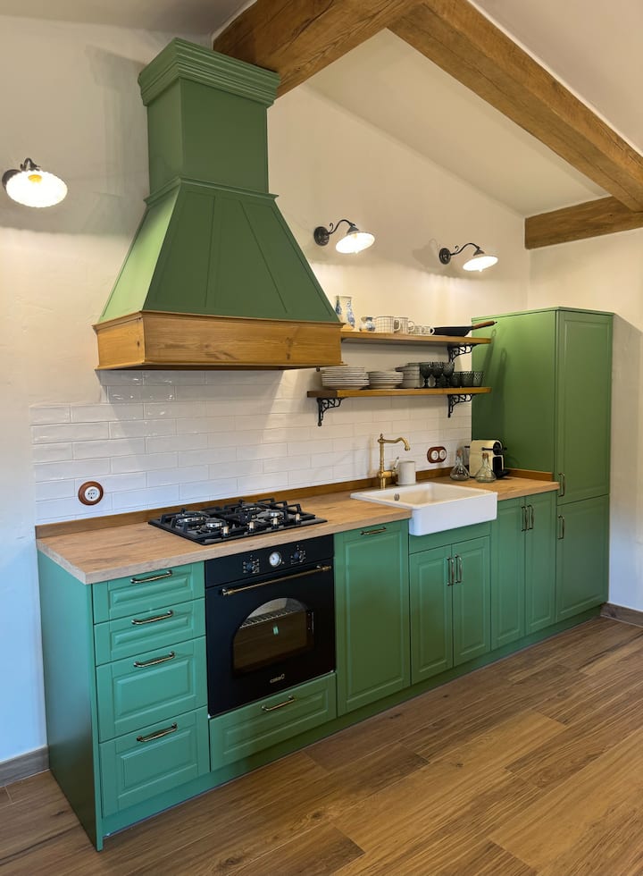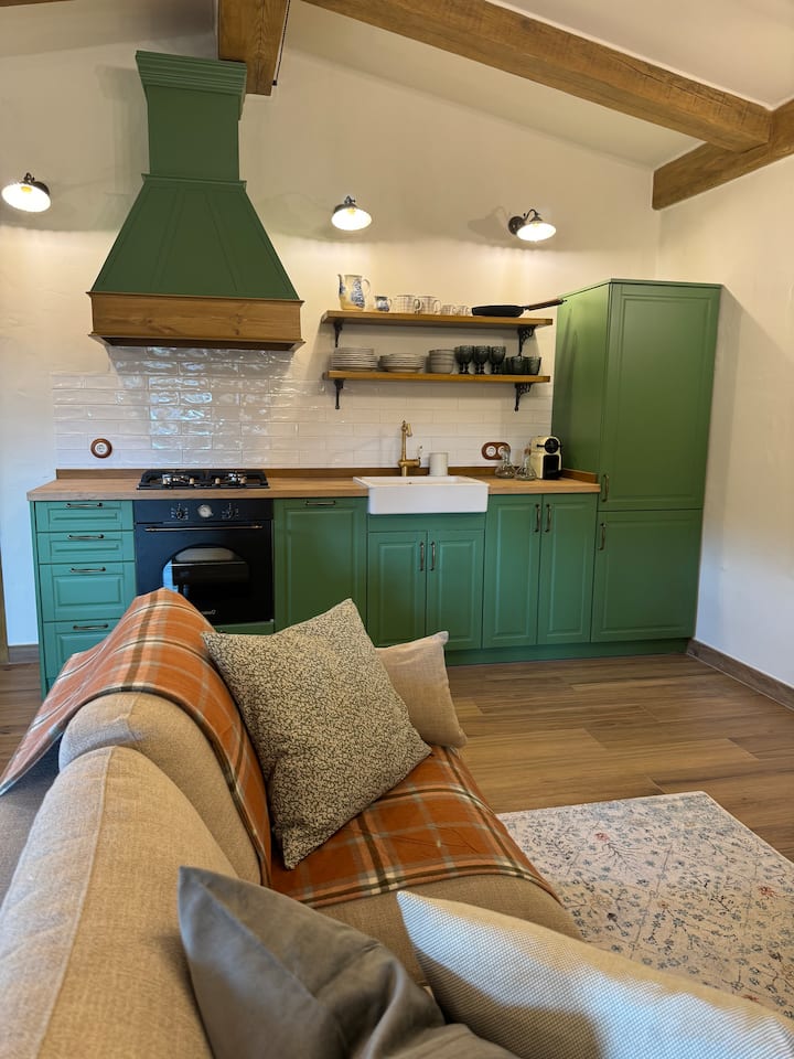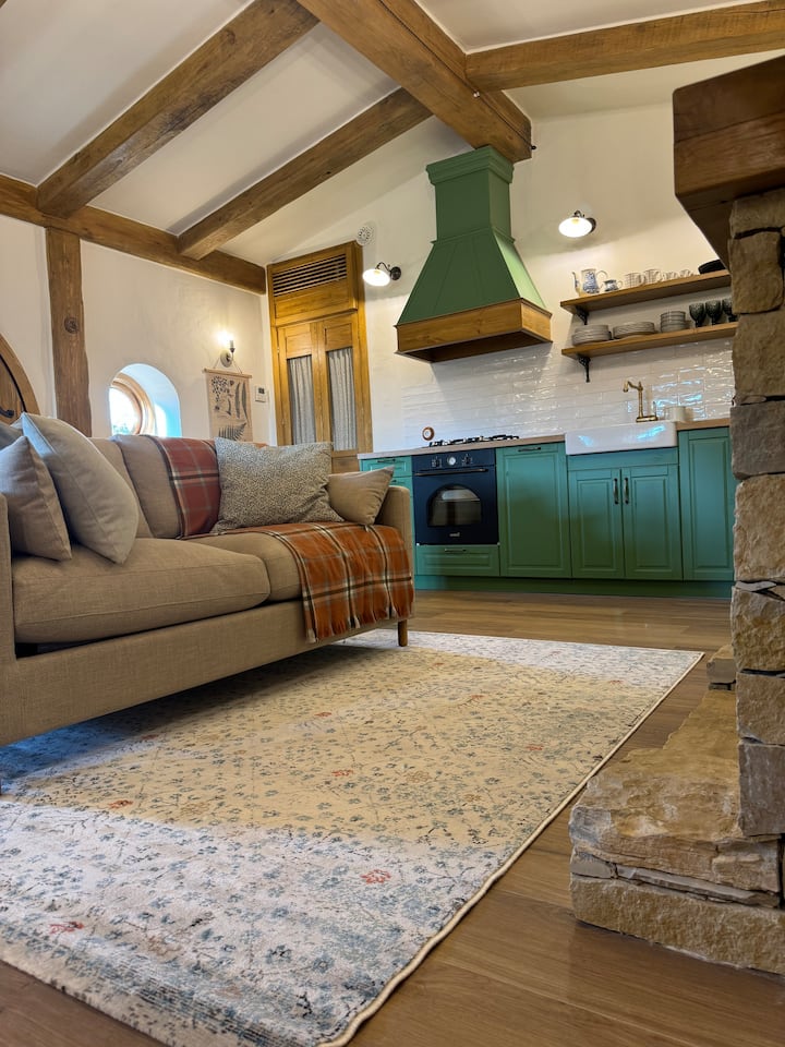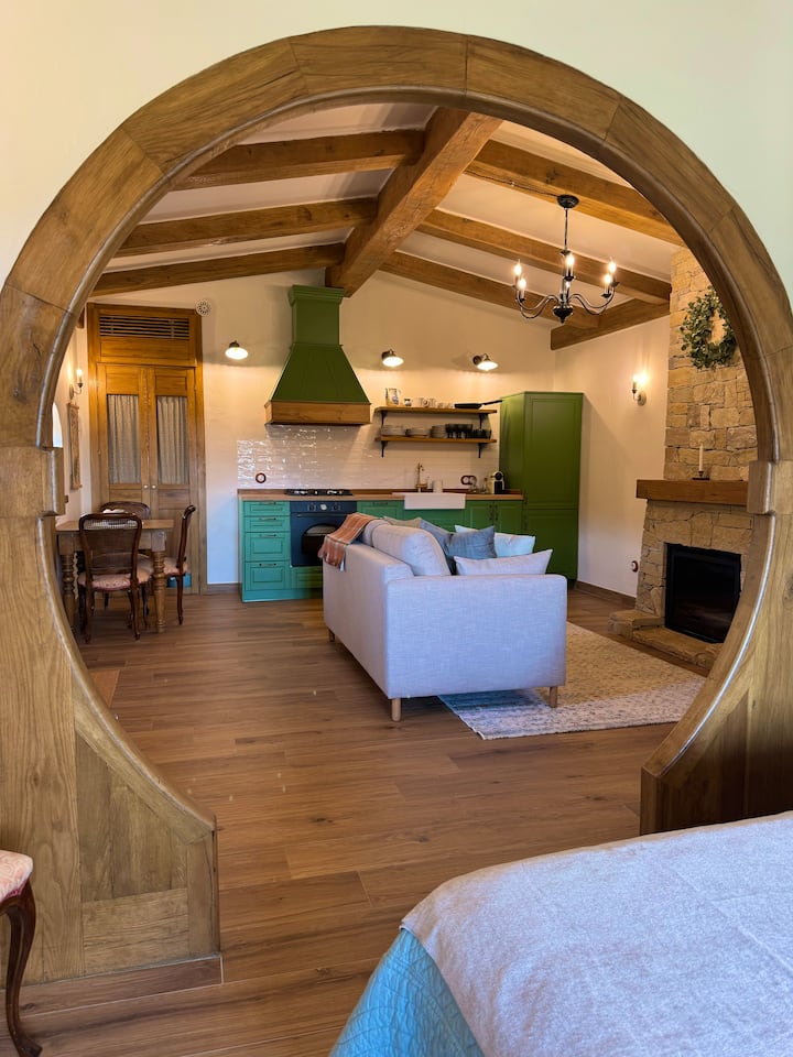 Kad uđete, dočekuju vas udobne sobe osvijetljene blagim svjetlom svijeća, visokim stropovima i izloženim drvenim gredama, gdje ručno izrezbareni drveni namještaj priča priče o izradi i predanosti, a impresivan kamin na drva postaje srce doma. Kamin od kamena širi topli zlatni sjaj koji osvjetljava prostor, stvarajući intimnu i ugodnu atmosferu savršenu za dijeljenje priča uz vatru.