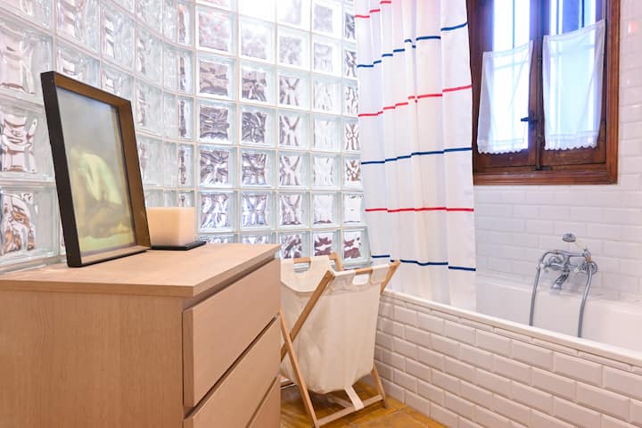 Kupaonica je prostrana i ima kadu, savršenu za uživanje u trenucima opuštanja. Neutralne pločice i suvremena završna obrada uravnotežuju dizajn, pružajući osjećaj čistoće i svježine bez gubitka toplog dodira koji karakterizira kuću.