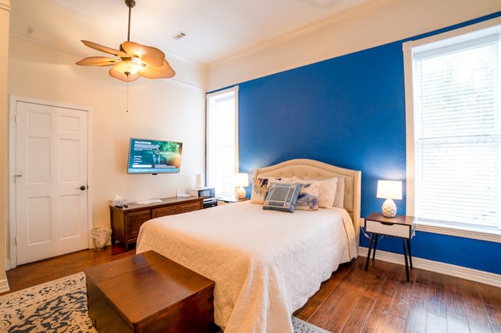 PROŠETAJTE CENTROM GRADA! Odsjednite u Eureka Springsu - Devine's Downtown je praktičan i prostran! Ovaj vrlo veliki trosobni stan nalazi se u samom srcu centra Eureka Springsa. To je veliki otvoreni prostor s dovoljno prostora za opuštanje. Uključuje potpuno opremljenu kuhinju, blagovaonicu i dnevni boravak. Značajke uključuju sustav za projekciju kućnog kina s surround zvukom i terasu s koje se pruža pogled na glavnu ulicu. Uključena su dva parkirna mjesta, a do Eureke možete jednostavno doći pješice. Balkon na prednjoj strani zgrade savršeno je mjesto za opuštanje.