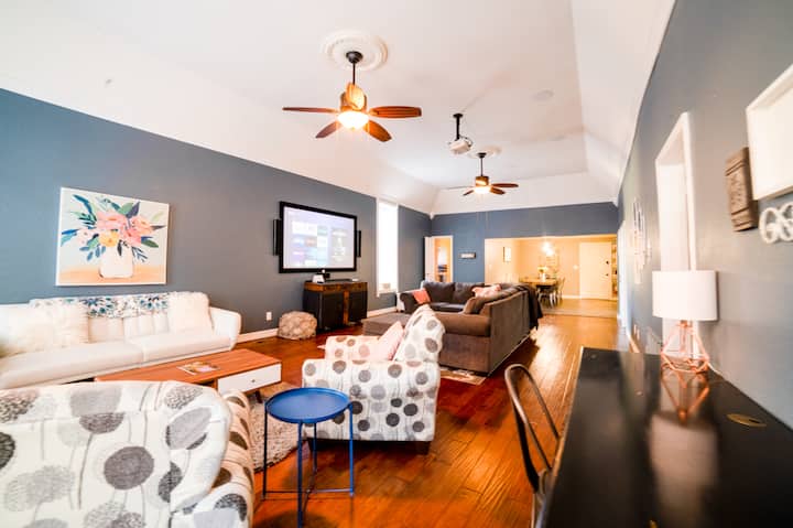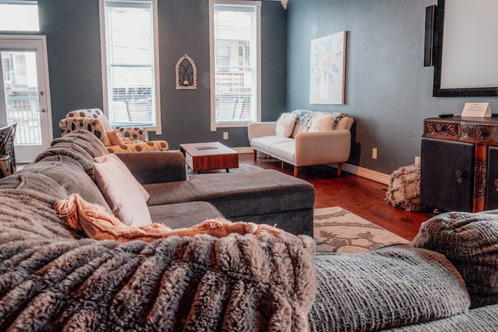PROŠETAJTE CIJELIM CENTROM GRADA! Ovaj vrlo veliki trosobni stan nalazi se u samom srcu centra Eureka Springsa. Dovoljno udoban za dvoje, ali može primiti do 11 osoba! To je otvoreni prostor s dovoljno prostora za opuštanje. Uključuje potpuno opremljenu kuhinju, blagovaonicu i dnevni boravak. Značajke uključuju projekcijski sustav kućnog kina s surround zvukom i balkon s koje se pruža pogled na glavnu ulicu. Uključena su dva parkirna mjesta, a do Eureke možete jednostavno doći pješice.