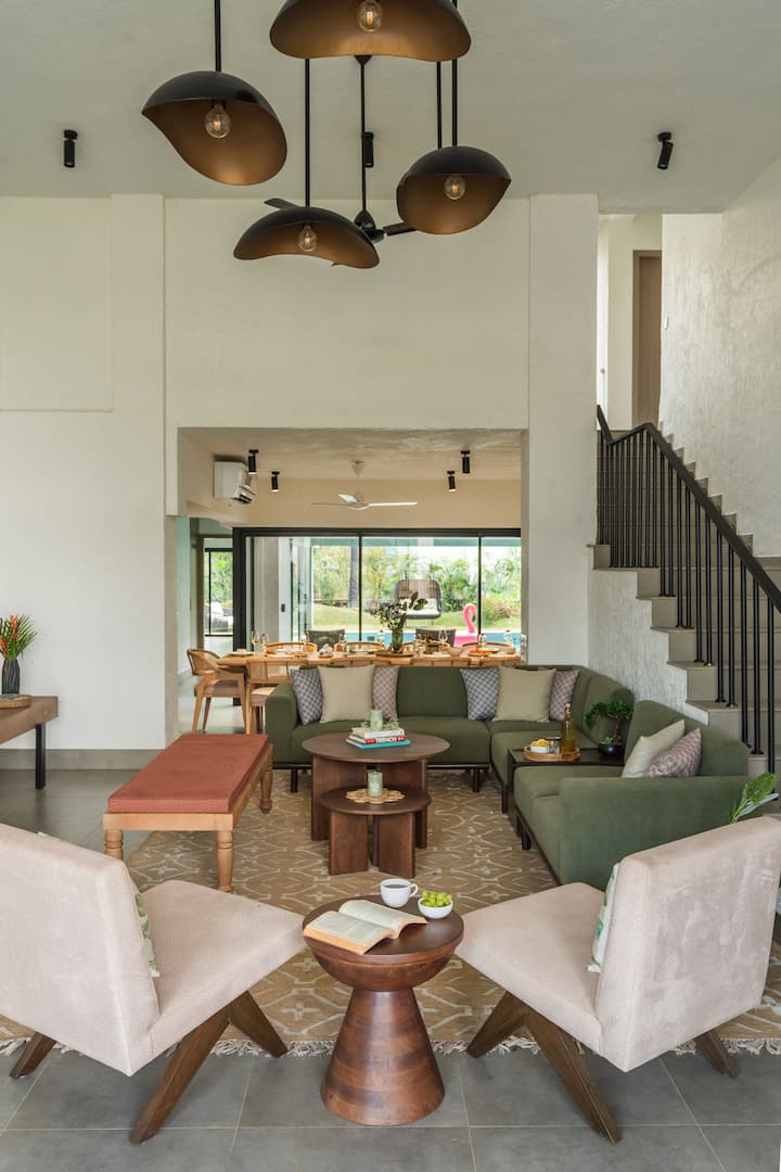 Umorni ste od betonske džungle? Žudite za dozom obalnog blaženstva? Ne tražite dalje od Sage Ville. Ova luksuzna vila s 5 spavaćih soba u Alibaugu mjesto je gdje se rižina polja spajaju s planinama, a vaše se brige tope. Zakoračite u ovaj arhitektonski dragulj i osjećat ćete se kao da ste naišli na tajni raj. The semi-indoor pool, a fusion of luxury and nature, is perfect for those who want to splash around in style.