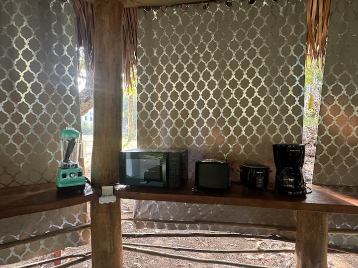 • Zajednička kuhinja Rancho: pripremajte obroke ili grickalice u našoj potpuno opremljenoj kuhinji na otvorenom – savršena za kuhanje svježih lokalnih sastojaka ili uživanje u ležernom obroku s drugim gostima. Opremljen aparatom za kavu, pitkom vodom, mikrovalnom pećnicom, hladnjakom, šalicama, čašama i priborom za vašu udobnost.
