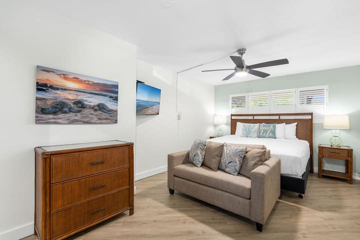 Nakon renovacije, Shores of Maui 215 je prekrasno uređen jednosobni stan s jednom kupaonicom koji spaja moderan dizajn s opuštenim životom na otoku. Smješten na zadnjem katu šarmantnog kompleksa uređenog u stilu vrta, smještaj pruža predivan pogled na ocean s privatnog lanaija, idealnog za uživanje u jutarnjoj kavi ili promatranje surfera u Cove Parku dok sunce zalazi u Tihi ocean.