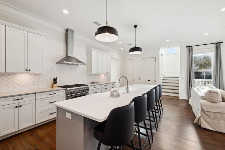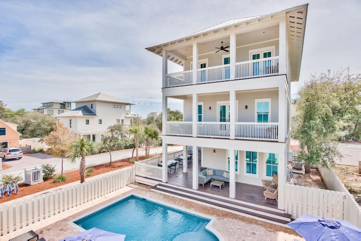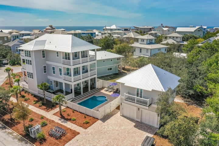 DETALJI: ne tražite dalje od ovog izvrsnog smještaja sa 6 spavaćih soba i 6,5 kupatila za savršen odmor od 30 A! S pogledom na zaljev, prekrasnim privatnim bazenom, više terasa, profesionalnom kuhinjom i kratkom šetnjom do plaže, ovo je profesionalno uređeno utočište Seagrove Beach u blizini Eastern Lakea. Kuhinja ima dizajnerske ormariće, plinski štednjak i odabrane uređaje od nehrđajućeg čelika. Veličanstveni drveni podovi otvaraju se prema blagovaonici sa stolom za 8 osoba i pultom na otoku za 5 osoba. Opustite se u dnevnom boravku ispred televizora ravnog ekrana i odnesite jutarnju kavu na terasu i uživajte u pogledu na Smaragdnu obalu iz ptičje perspektive. Aquamarine water and white quartz sand beaches are just a short walk away.