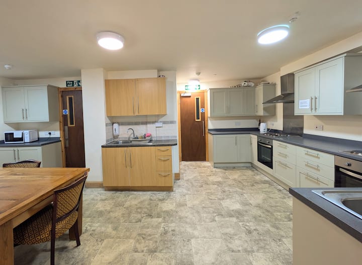 Privatne kupaonice u sobama sadrže osnovne, ali funkcionalne sadržaje za tuširanje, WC i umivaonik. Ne pružamo obroke, ali imate na raspolaganju zajedničku kuhinju. Preporučujemo Cavens Arms i Robert the Bruce (Weatherspoons) uz cestu, ili nekoliko dobrih kafića na ulici High Street. Gostima je na raspolaganju jedna od dvije velike zajedničke kuhinje s vlastitim ormarićem s hranom i policom u zamrzivaču i hladnjaku. Ima tava, pribora za jelo, posuđa itd. Imajte na umu da su kuhinje prilično osnovne i da zbog prirode kuće (dijeli se s dugoročnim profesionalnim najmoprimcima) ne mogu biti tako čiste kao smještaj na Airbnbu koji gosti sami opskrbljuju hranom i koji je prazan i dubinski očišćen između gostiju. To se odražava u našoj cijeni. Sustanari su dobri u pospremanju za sobom, a tu je i tjedni čistač. Ako želite besprijekorno čistu kuhinju, ovo nije mjesto za vas. 3 ploče za kuhanje (metalna ploča) i pećnice imaju oznake koje su očišćene, ali mogu se koristiti, a za one koji nisu toliko skloni izazovima, ostale 3 staklene ploče za kuhanje i pećnice prilično su nove. Spavaća soba vrlo je čista.