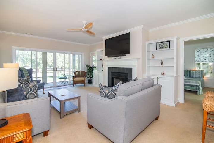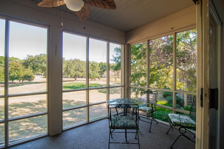 Privlačan dnevni boravak naglašen je zidom s prozorima i kliznim staklenim vratima koja se otvaraju na trijem s mrežom, opremljen udobnim vrtnim namještajem - idealnim za objedovanje, opuštanje uz knjigu ili gledanje golfera u akciji. Kondominij je opremljen televizorima ravnog ekrana, bežičnim internetom, stropnim ventilatorima te perilicom i sušilicom. Dobro opremljena kuhinja ima bar za doručak, novi električni štednjak, mikrovalnu pećnicu, perilicu posuđa, aparat za kavu te sve potrebno posuđe, pribor za jelo i posuđe.