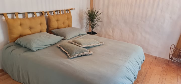 • 1 apartman s bračnim krevetom od 160 cm u maloj gospodarskoj zgradi na 2 kata s kupaonicom i WC-om.