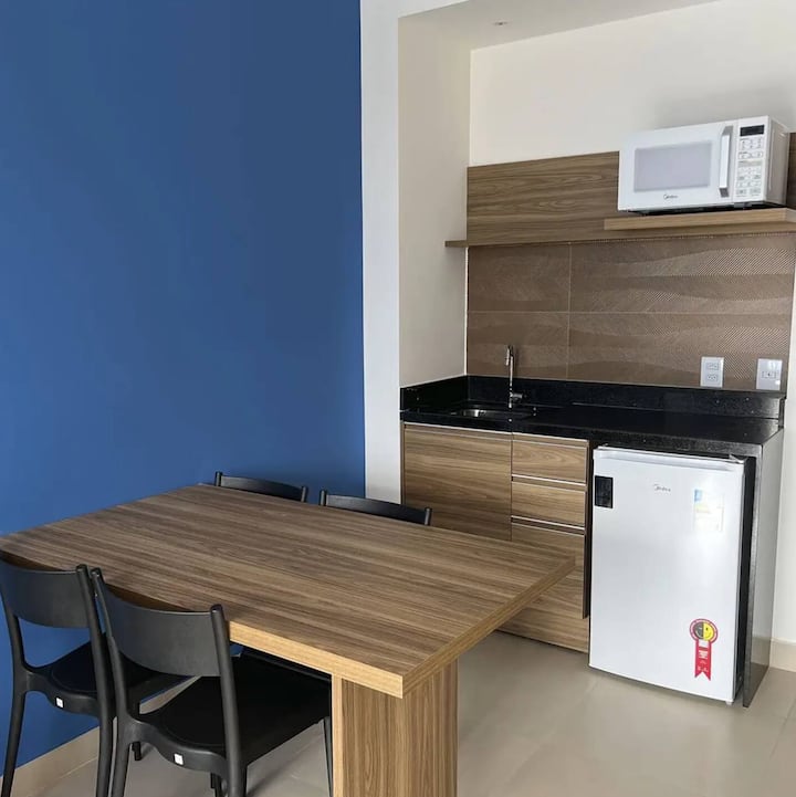 Američka kuhinja: mikrovalna pećnica, minibar, sudoper i blagovaonski stol.
