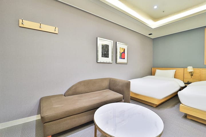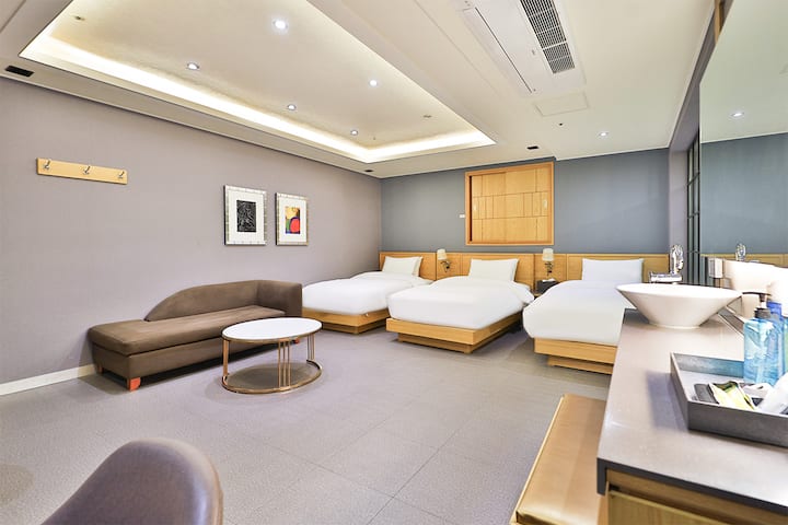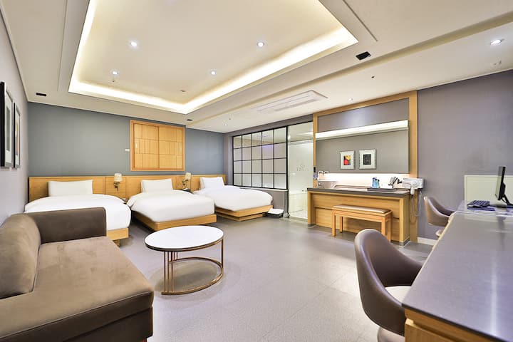 U trokrevetnoj sobi u hotelu Busan Ivy nalazi se 55UHD pametni TV, luksuzna posteljina, krevet za jednu osobu (3) i OTT.