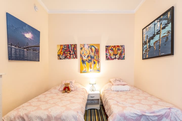 --Spavaća soba s dva odvojena kreveta: dva odvojena kreveta s dovoljno prostora za odlaganje.