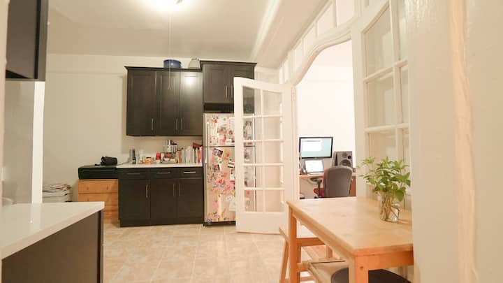 Mi smo obitelj umjetnika. Dvije odrasle osobe i dvoje djece. Između ostalog, bavimo se kiparstvom, plesom i glazbom. Putujemo ljeti, pa je tada naš stan dostupan. Imamo drage prijatelje koji vas mogu dočekati i pomoći vam ako vam je potrebna pomoć u našem domu. Prostor je otvoren i svijetao s dovoljno mjesta za dva para ili obitelj.