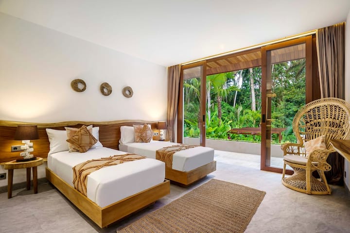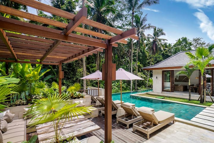 Okružena zelenom prirodom, nudi nevjerojatan preljevni bazen, 3 spavaće sobe s prekrasnim pogledom na prirodu i vanjski prostor za opuštanje, ova je vila savršen odmor za vas i vaše prijatelje/obitelj! Nova i moderna nekretnina s bijelim i drvenim elementima u kojoj ćete se osjećati dobro i uživati u svom boravku u Ubudu.