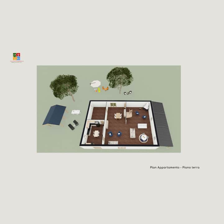 Prostrani vanjski prostor jedna je od njegovih posebnosti. Veliki vrt, opremljen roštiljem, stolovima i stolicama, idealan je za objedovanje na otvorenom u miru sela. Doživljaj upotpunjuje prekrasna panoramska terasa savršena za opuštanje i uživanje u okolnom krajoliku.