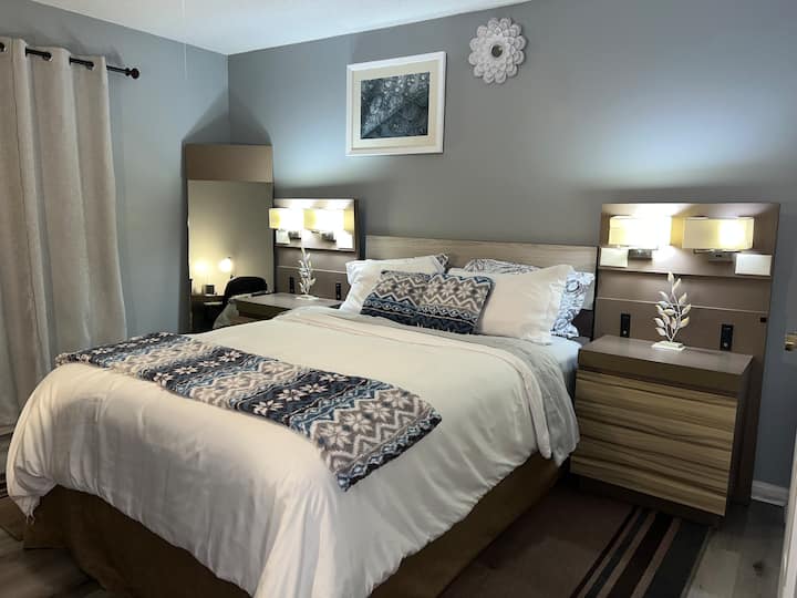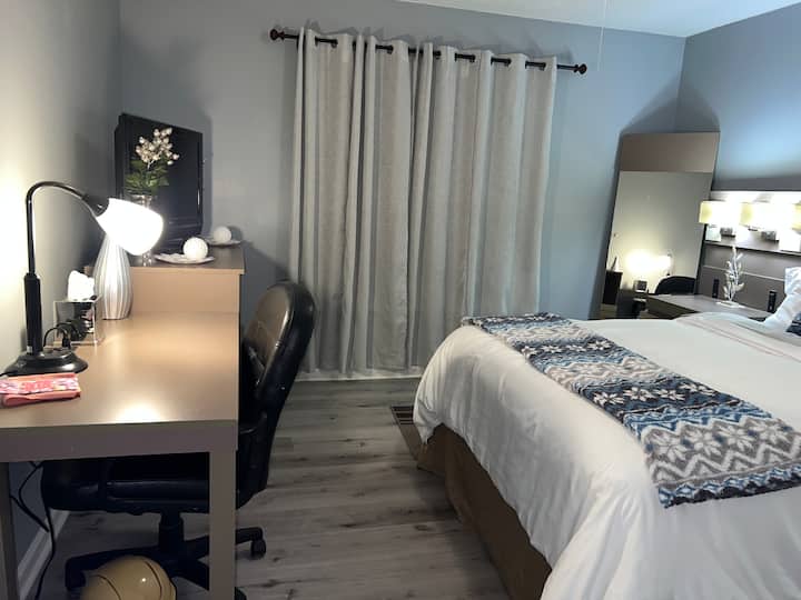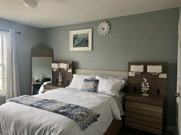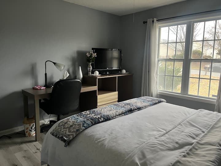Naš je smještaj udaljen 15 minuta od zračne luke Piedmont Triad i 10 minuta od centra Greensboroa. Imat ćete privatnu sobu s bračnim krevetom (160x200), prostorom za rad i zajedničkom kupaonicom u zajedničkoj kući. Gosti dijele kuhinju, dnevni boravak i praonicu rublja. Vrijeme kad mora biti tišina: 22:00 – 7:00. Nema posjetitelja. Pobrinite se da zajedničke prostorije budu čiste. Jedno parkirno mjesto po sobi. Nadzorne kamere u kući. Fleksibilni uvjeti dolaska/odlaska na zahtjev. Unaprijed nam javite vrijeme dolaska