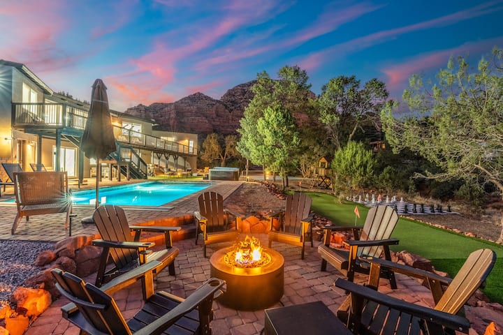 Pobjegnite u ovaj smještaj s 5 spavaćih soba u Sedoni s pogledom na crvene stijene koji oduzima dah, a odmah je pored pješačkih staza. Uđite i vidjet ćete kako su dnevni boravak, kuhinja i blagovaonica u otvorenom rasporedu. Osim toga, televizori su u svakoj spavaćoj sobi, uključujući casitu. Na raspolaganju su vam brojni sadržaji na otvorenom, uključujući veliku drvenu terasu, bazen, masažnu kadu, teren za pickleball, šahovsku ploču u prirodnoj veličini, vanjsko ognjište i ljuljačke. Tu je i kino dvorana u casiti! Savršeno za grupe koje traže avanturu i opuštanje. Rezervirajte odmah i uživajte u nezaboravnom doživljaju Sedone!