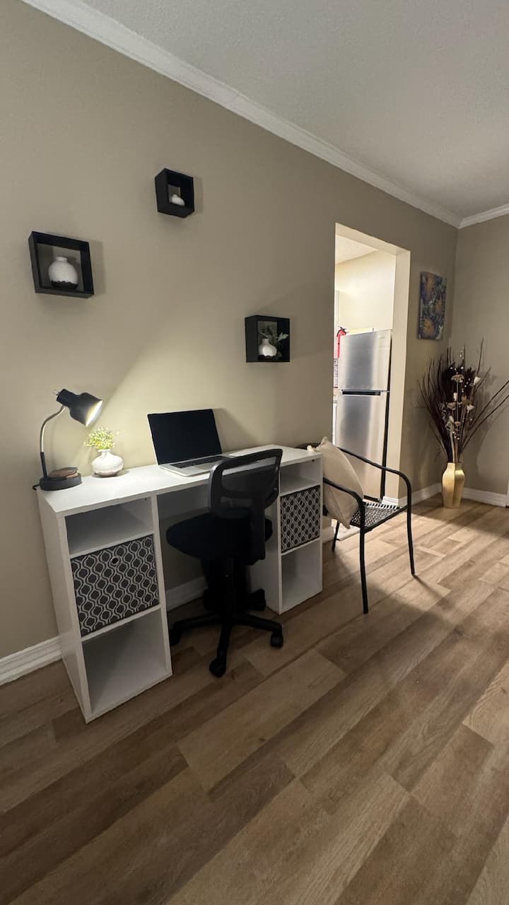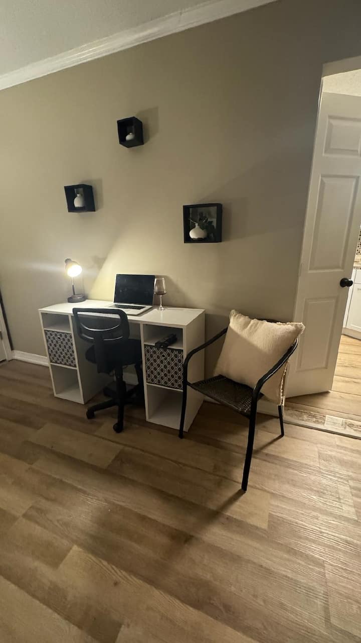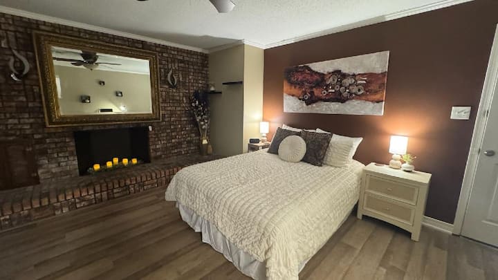 Spavaća soba je veliki prostor dimenzija 20 x 22 koji je prije mnogo godina bio garaža za dva automobila. Ima prekrasan zid od opeke s kaminom (žao nam je, ali osiguranje nam ne dopušta da gosti u njemu pale vatru). Imamo svijeće na baterije. Ima prekrasne nove podove od drvenih pločica, lijep radni stol za radni prostor s brzim Wi-Fi-jem i pojačalom signala u prostoru tako da nema kašnjenja u streamanju filmova ili Zoom sastancima. Veliki televizor s ravnim ekranom montiran je na zid ispred kreveta kako bi se moglo udobno gledati televiziju u krevetu. Imamo prostor za odlaganje u stilu komode ispod televizora za odlaganje odjeće i osobnih stvari.