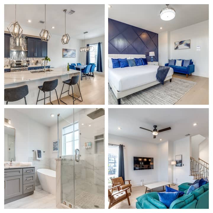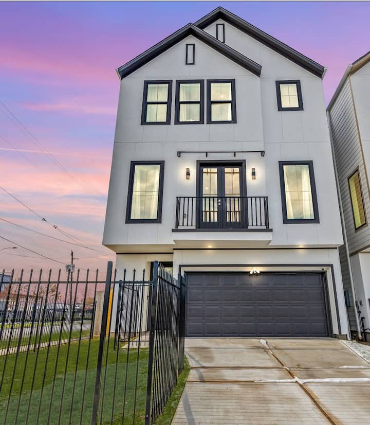 Uživajte u našoj novoj kući s 4 spavaće sobe i 3,5 kupaonice, udaljenoj samo 2 minute od Downtowna! Naš se smještaj nalazi u središtu Houstona i omogućuje jednostavan pristup cijelom Houstonu. Novoizgrađen, naš je dom dobrodošlo mjesto za obitelj i prijatelje. Prikladno za kućne ljubimce, slobodno povedite svog krznenog prijatelja. Doživite znamenitosti i zvukove vlaka Union Pacific koji prolazi ulicu dalje od našeg balkona!