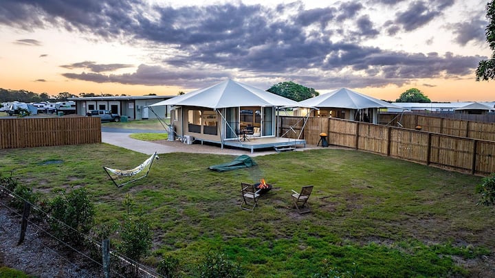 Unutar ovih potpuno samostalnih šatora gosti će pronaći čajnu kuhinju, kupaonicu i luksuzni bračni krevet s posteljinom. Šatori su opremljeni obiteljskim igrama za zabavu svih i velikom terasom s koje se pruža slikovit pogled na priobalnu prašumu. Osim toga, tu je i kauč na razvlačenje za djecu, a paketi posteljine mogu se unajmiti radi dodatne praktičnosti (moraju se kupiti u trenutku ugovaranja rezervacije). Za one sa starijom djecom kojima je draže tradicionalno iskustvo kampiranja, ima dovoljno mjesta ispred glamping šatora za šator ili mali šator.