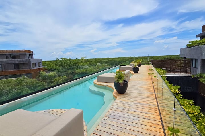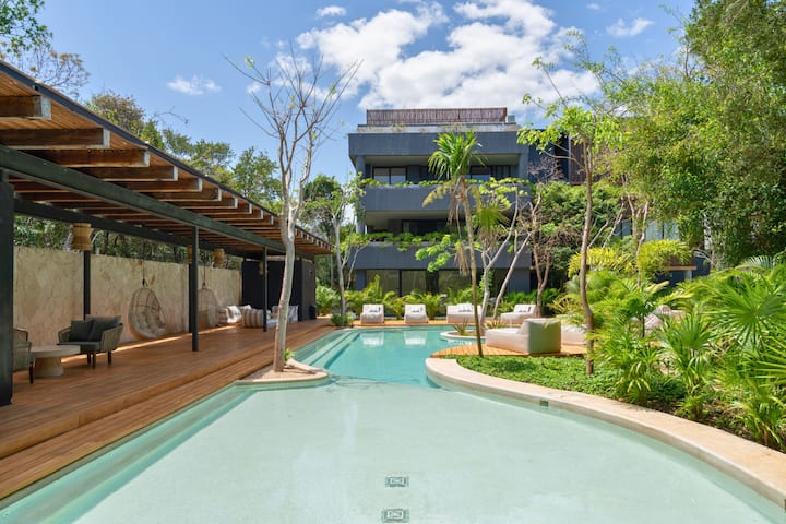 Zaboravi neasfaltirane ceste i neizvjesnost. Ovaj spektakularni stan s 2 spavaće sobe (povezan s drugim stambenim jedinicama) nalazi se u Tulumu 101, najekskluzivnijoj i najsigurnijoj ograđenoj zajednici na ovom području, s popločanim ulicama, non-stop zaštitarskom službom i vrhunskom arhitekturom koja se stapa s džunglom.