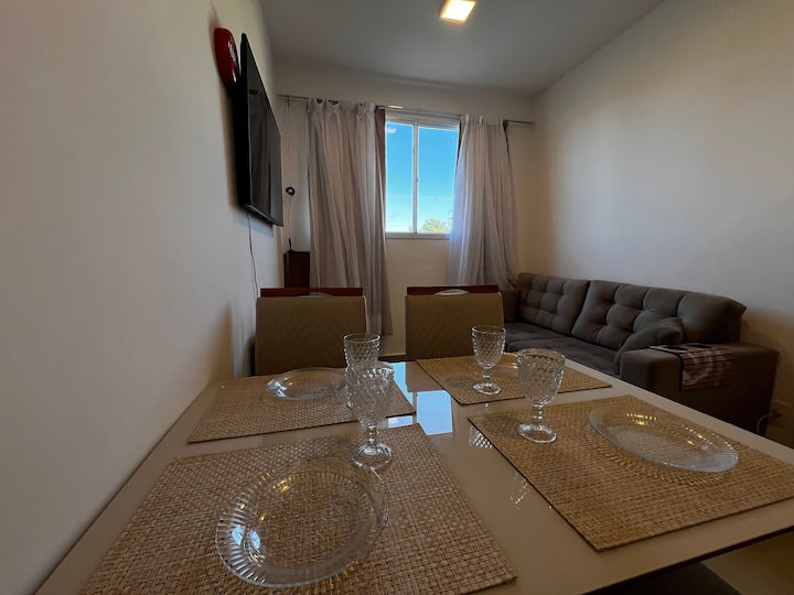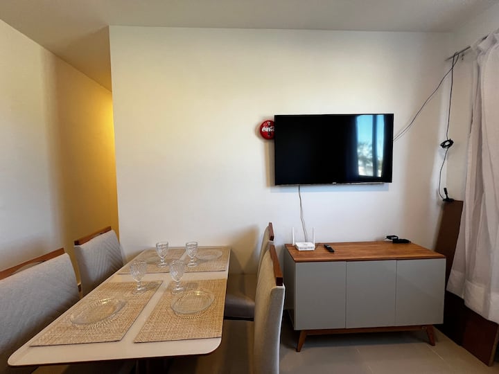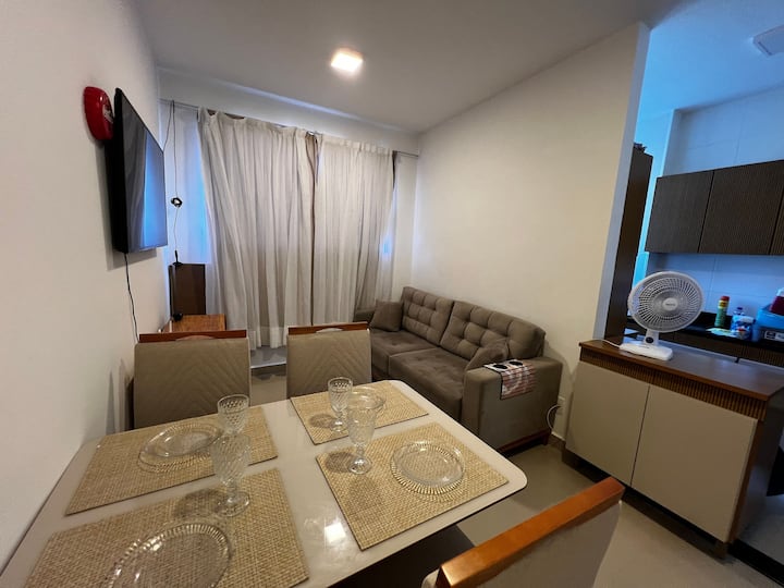 Stan s dvije spavaće sobe, manje od 1 km od plaže Ponta de Campina, obje s klima-uređajem i bračnim krevetom. U dnevnom boravku nalazi se televizor, ventilator i kauč, kupaonica za goste, kompaktna kuhinja s osnovnim priborom kao što su štednjak, hladnjak i aparat za sendviče. Može spavati do 4 osobe, idealno za obitelj i grupu prijatelja. Kondominij je nevjerojatan, s bazenom u prizemlju, velikim i prozračnim prostorom, stolicama, fiksnom garažom i 24-satnim conciergeom.